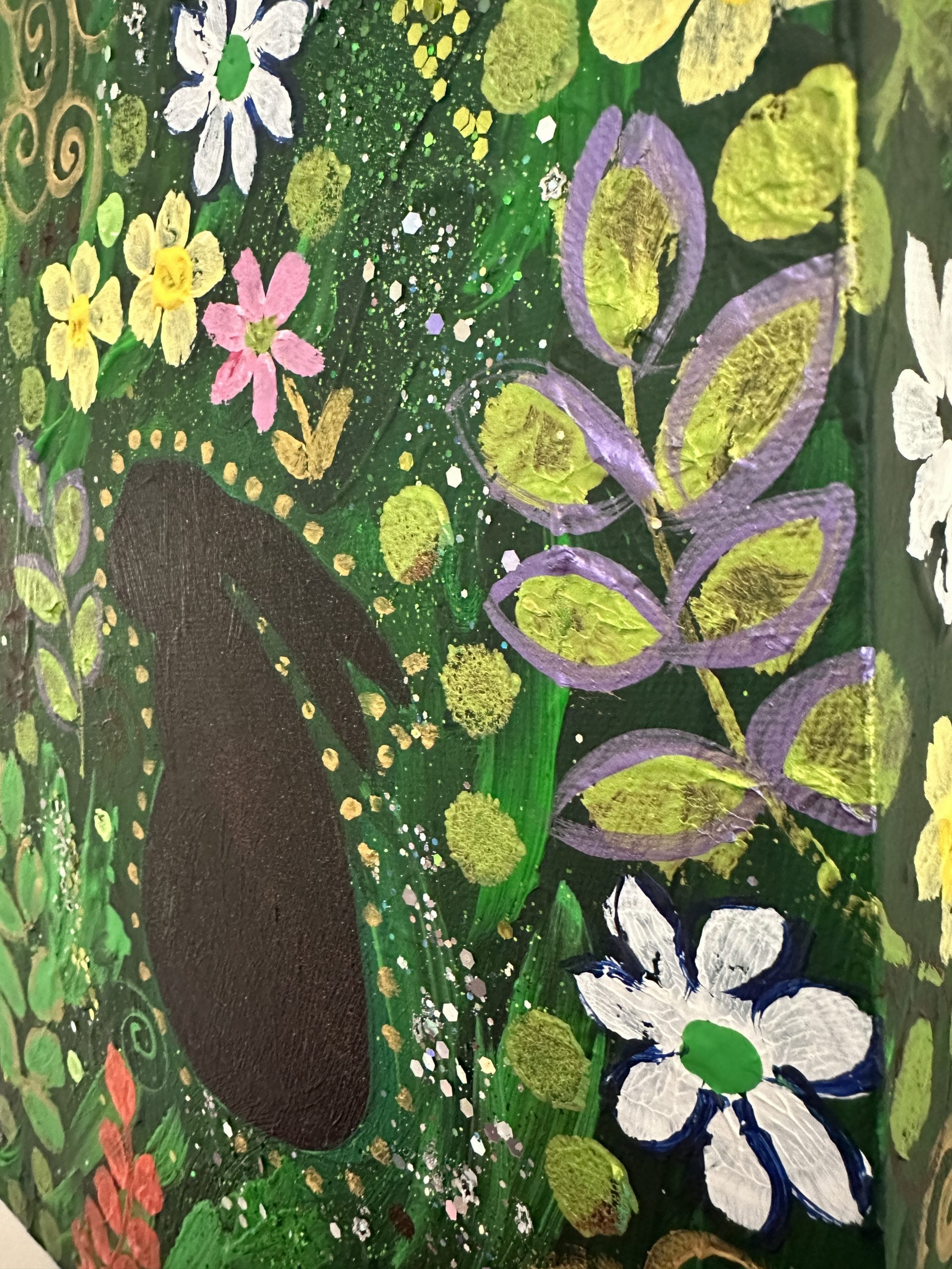 An original tree painting with hares in acrylics, metallics and sparkles on canvas.