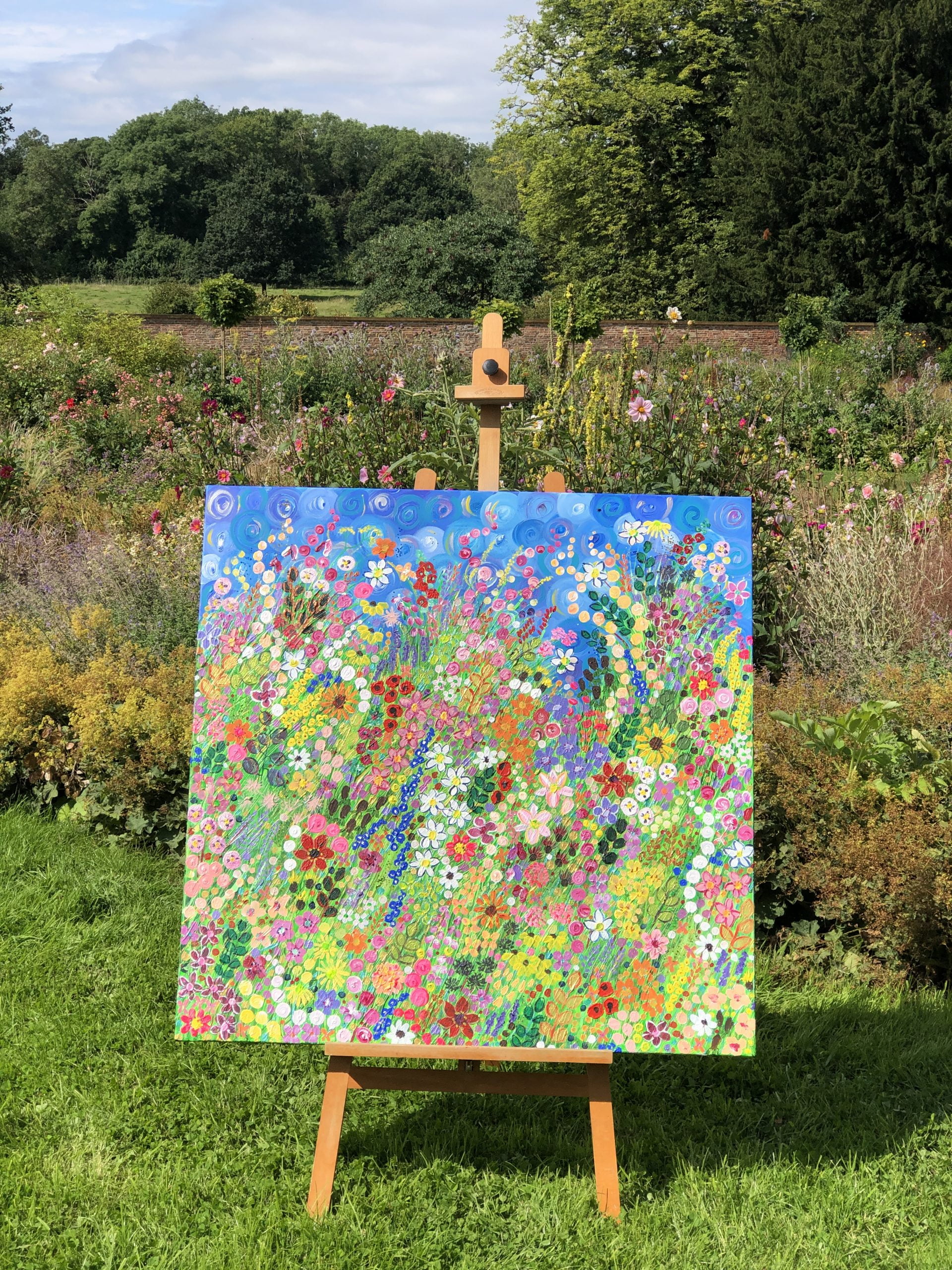 The first image is of the finished painting in the glorious gardens at Kelmarsh Hall where it was partially painted with the rest of the work in my studio. Large canvases like this are difficult to work on outside as any wind can mean the canvas takes off like a sail. Insects love to flutter among the painted flowers as they attempt to find the nectar and pollen that they need.