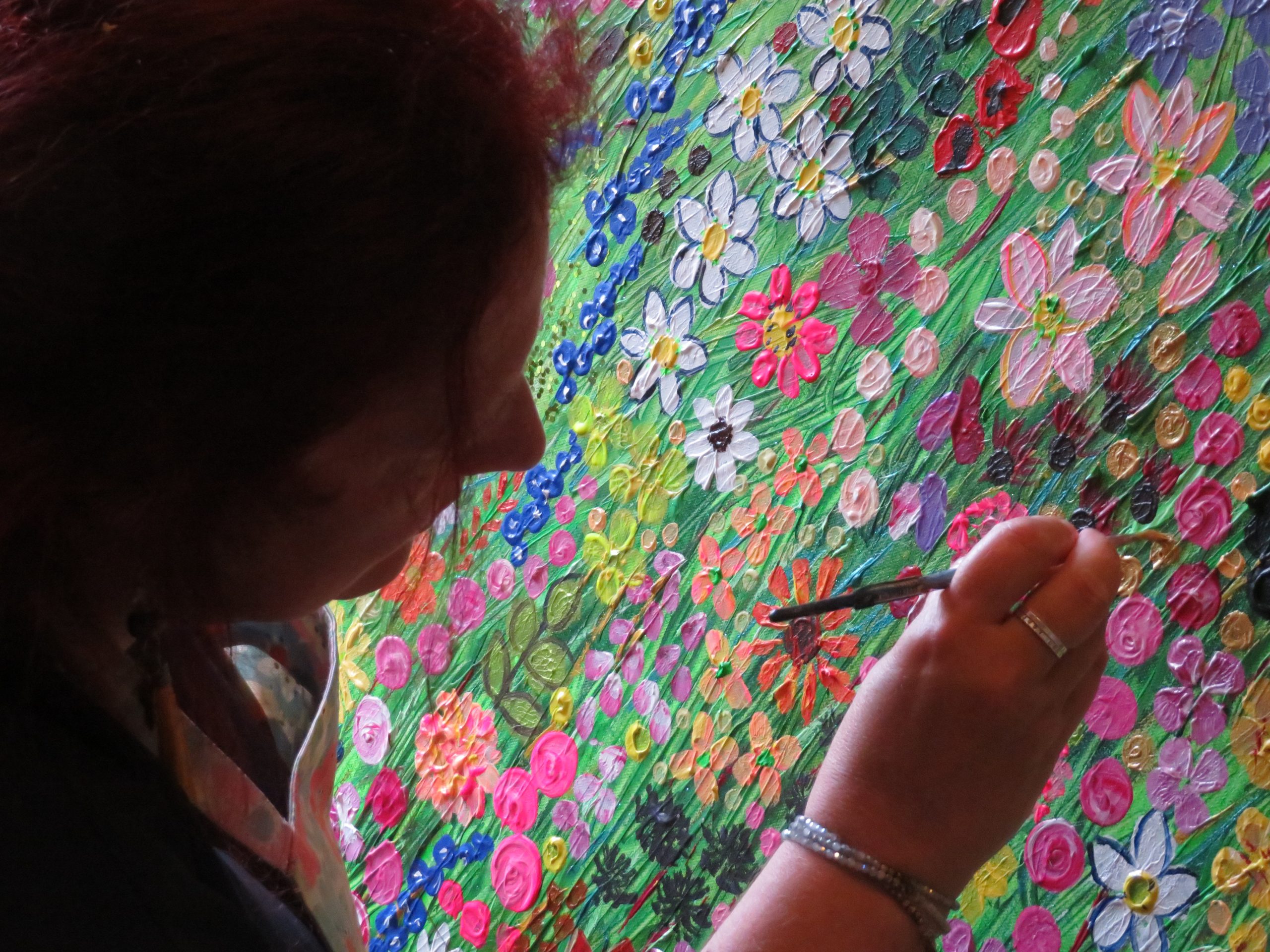 An original flower painting of the FLOWERS OF KELMARSH HALL AND GARDENS in acrylics, glitters and metallic paints. This statement painting will look stunning on any wall in your home or office. A contemporary painting, this colourful wall art is a fabulous flower painting in many colours.