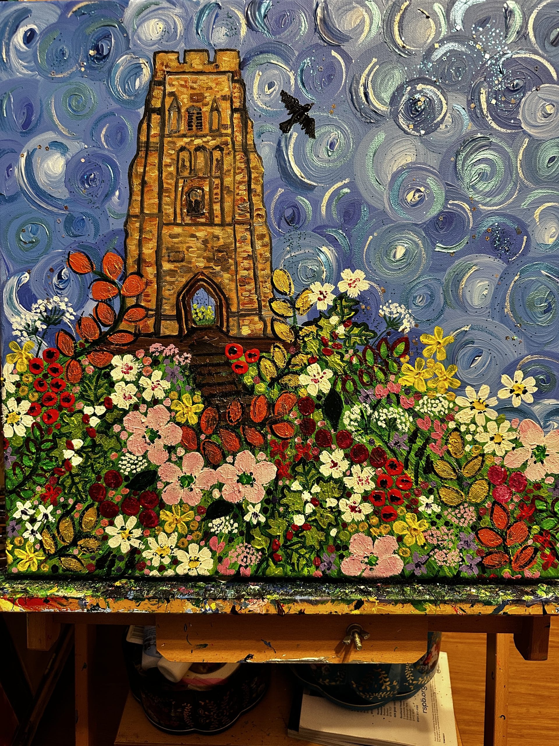 In art landscapes often serve as a canvas for emotions, stories, and the beauty of nature. This original painting of Glastonbury Tor captures a moment where history and nature intertwine inviting you the viewer to step into a world of colour and imagination alongside the past and the present.