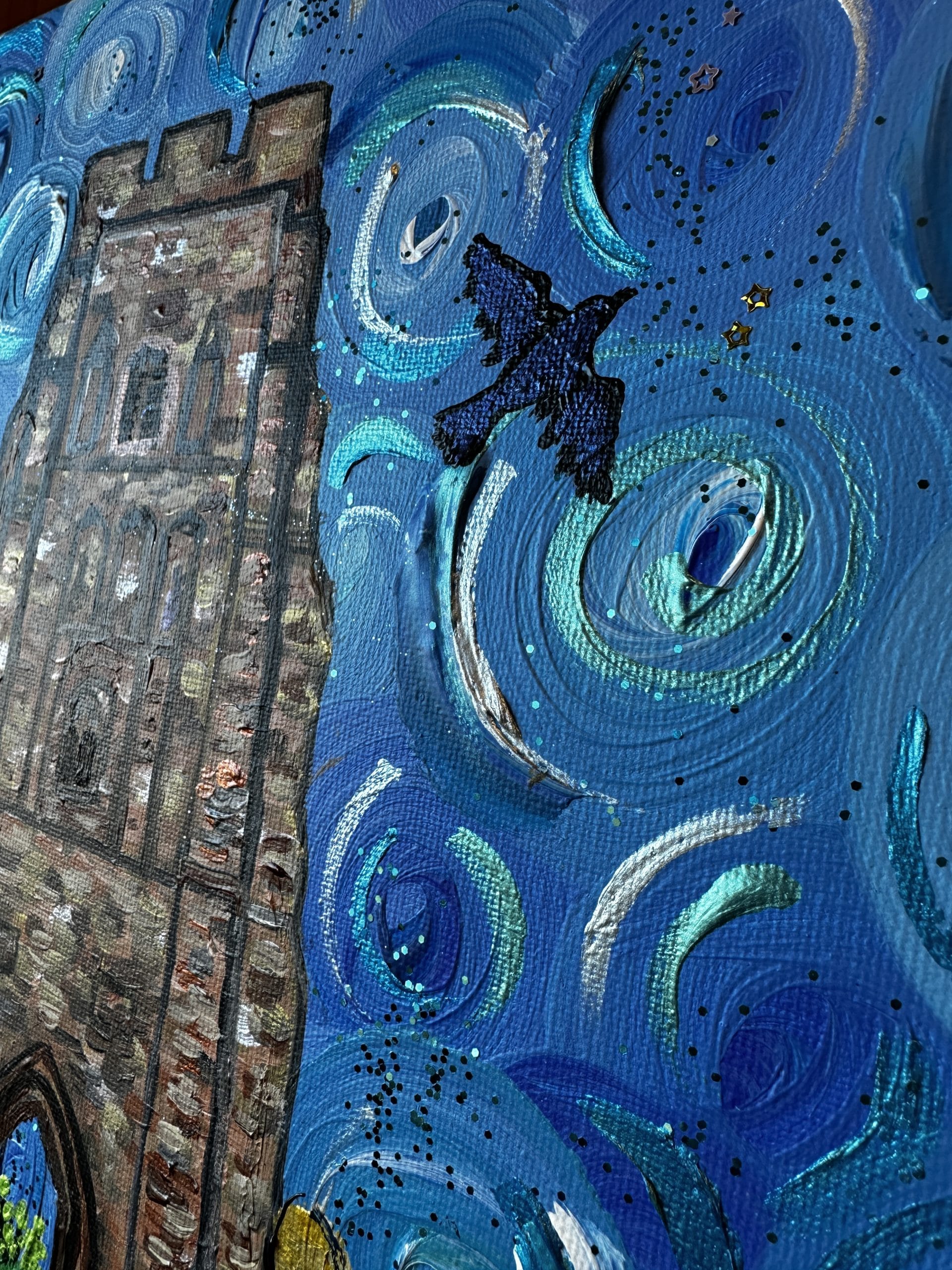 At the heart of this painting stands the majestic tower atop the Tor standing proud against a backdrop of swirling blues that mimic the sky’s ever-changing moods.